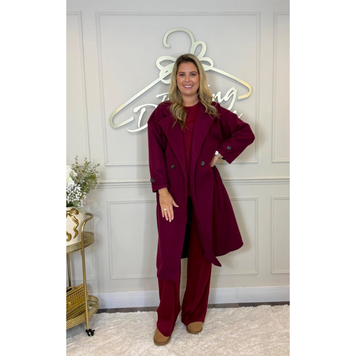 Long, straight cut, coat with removable belt. Tailored collar with wide lapels. Button cuffs. Integrated side pockets.