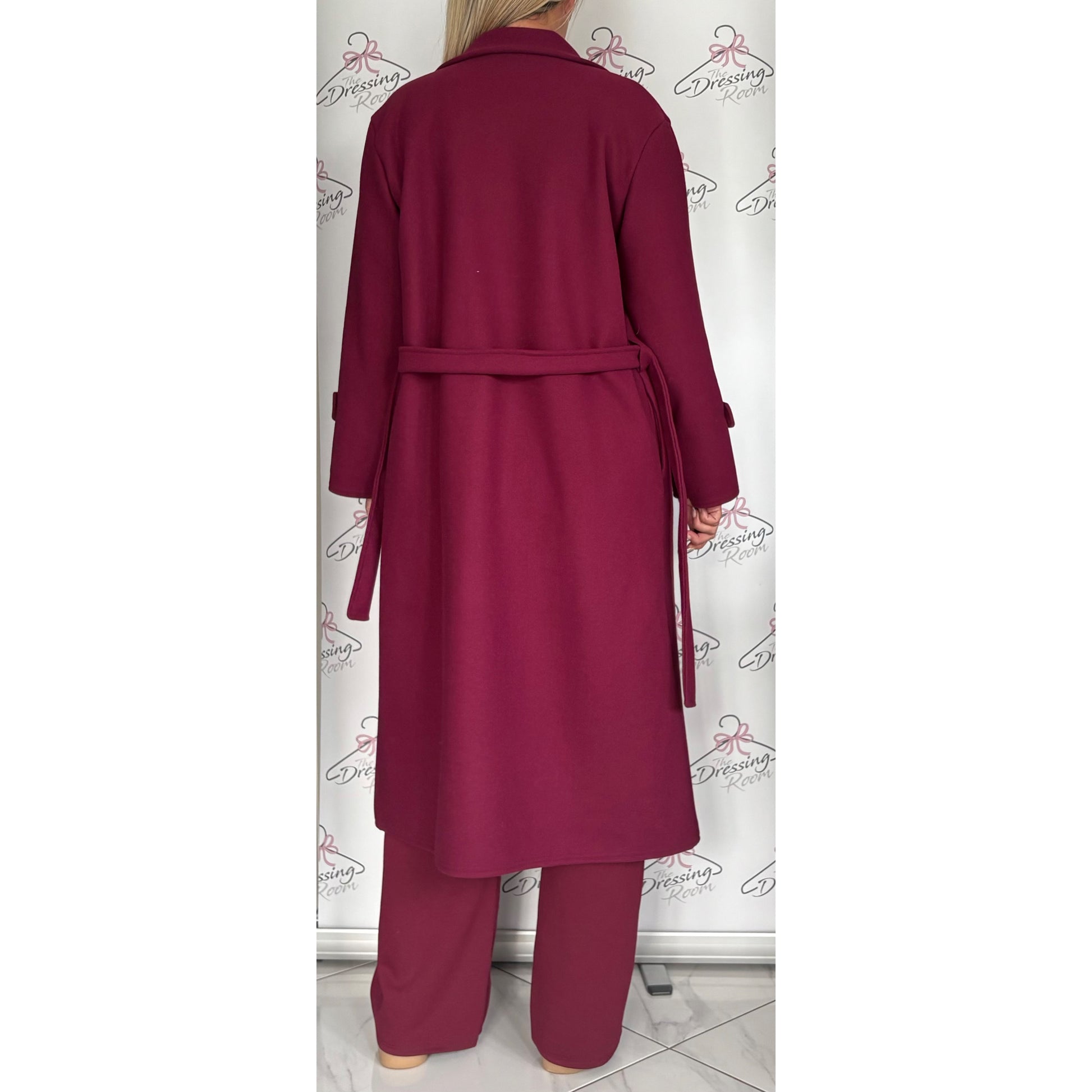 Double Breasted Belted Coat in Dark Cherry