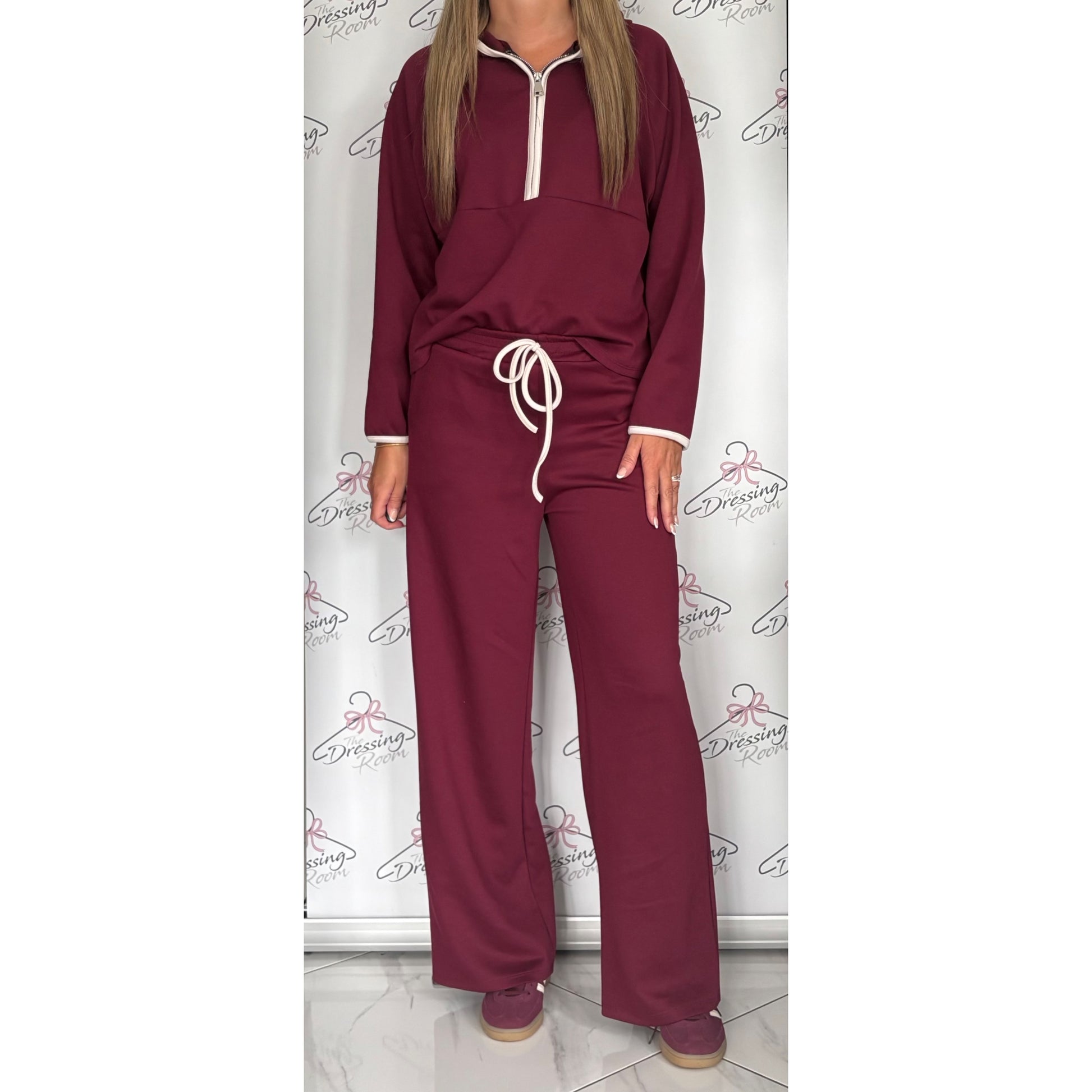 Hooded, half zip, long sleeved sweatshirt and coordinating straight leg trousers. Contrast piping detail in White.